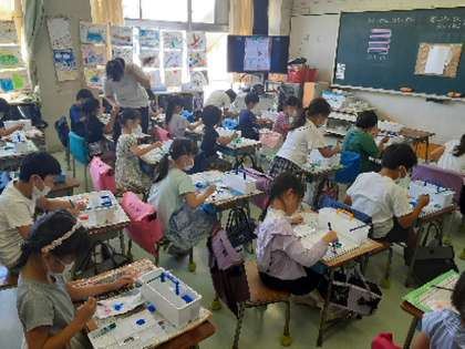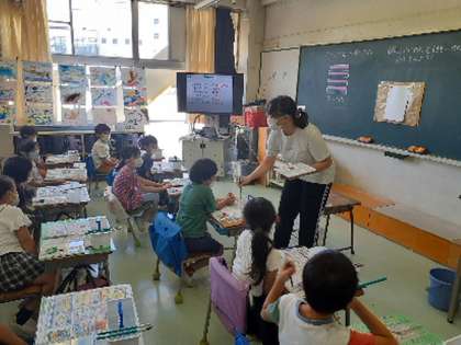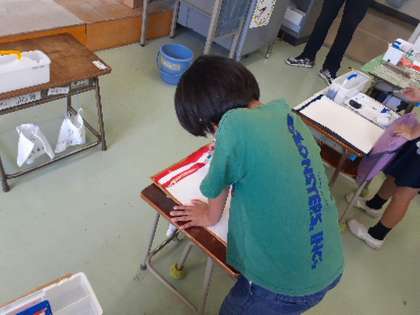 1年生は絵の具セットの使い方を学んでいます。パレットや水入れの道具はたくさんの仕切りがありますが、しきられた一つ一つのお部屋には役割があることや、絵の具を水に馴染ませる方法などを大画面テレビを使った分かりやすい説明を聞いて学んでいきました。今日は画用紙に思い思いの色で太い線と細い線を描き分けていきました。絵の具が手についても気にせずに、楽しく一生懸命取り組んでいました。