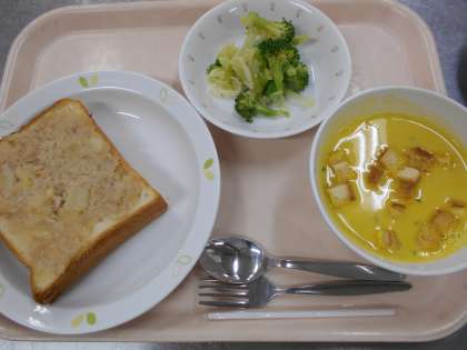 ツナポテトースト かぼちゃのポタージュ ブロッコリーのサラダ 牛乳