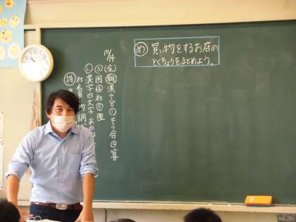 以前、農家の仕事について学んだ3年生は、次にスーパーマーケットについての学習が始まりました。普段お家の方の買い物のお手伝いで行くことも多いようで、スーパーマーケットの特徴について、次々に意見が出されました。昔の買い物のしかたも考えてみました。それと比較することで、一つの店で食材をそろえることのできるスーパーマーケットは、買い物客の願いを全てかなえるお店だということが分かりました。