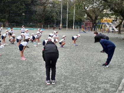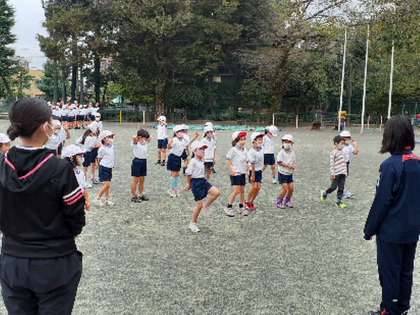 今本校では、教育インターンシップの学生と砧中の職場体験実習生を受け入れています。今日の2時間目は1年生の体育で、ライン引きの手伝いや子どもの運動相手をして授業づくりに参加しました。子どもたちも温かく受け入れ、すぐに仲良くなっていました。
