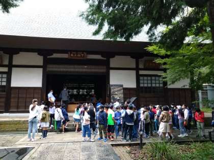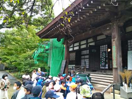 浄真寺の方の説明を真剣に聞いています。とても立派です。浄真寺では8月には、さぎ草が咲くそうです。さぎ草は世田谷区の花です。