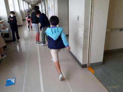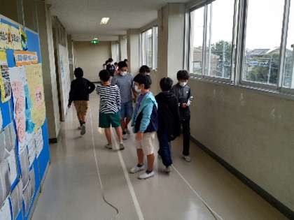 5年生の算数では平均の学習をしています。廊下にメジャーをおき、10歩の長さを測り、自分の平均の歩幅を調べました。平均の考え方とともに、量感を養い実生活に生きる体験的な活動となりました。