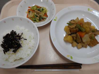 ごはん ひじきのふりかけ 小松菜サラダ 筑前煮 牛乳