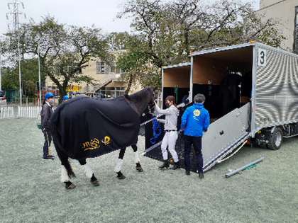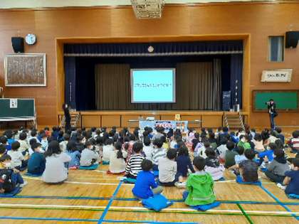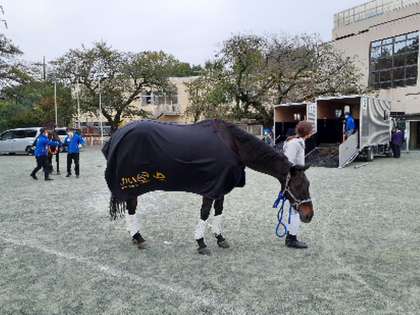 今日は2年生の馬!ふれあい体験授業です。元競走馬が学校に来てくれました。名前は「ネコパンチ」。JRAで活躍したサラブレッドです。まずは座学で馬について学び、その後校庭でふれあい体験やサラブレッドのショーを見ます。