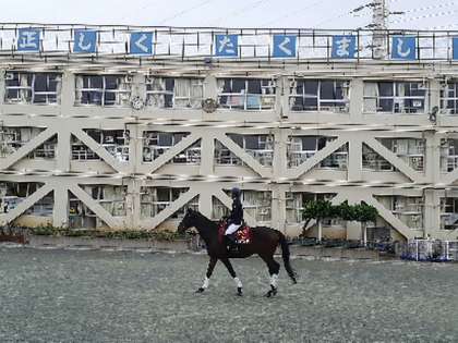 ショーに向け、ウォーミングアップを始めました。校舎をバックに美しいフォルムのネコパンチ号が悠々と歩いています。
