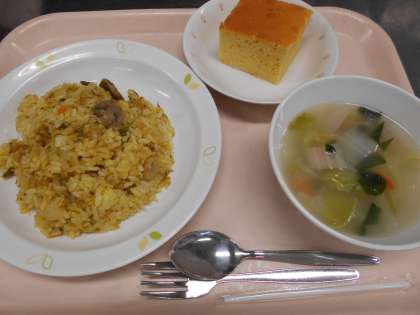 カレーピラフ ベーコンと白菜のスープ ぐりとぐらのかすてら 牛乳