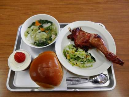 2学期の給食も今日が最終日です。献立も季節に合わせてクリスマスメニューでした。ちょっと豪勢なメニューです。全員残さず食べていました。
