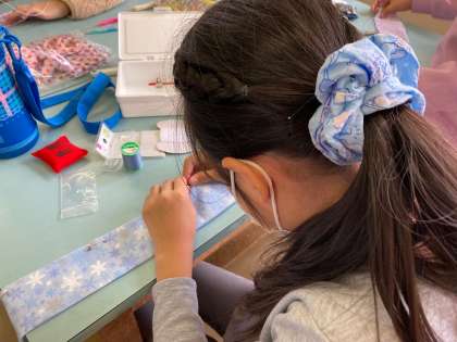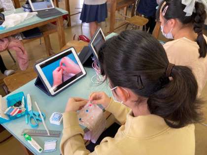 手芸クラブではシュシュ作りに挑戦。動画を参考に針を操りました。