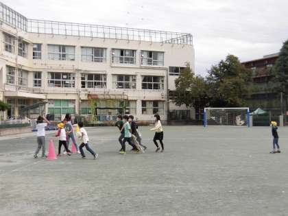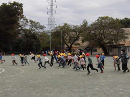 6年生が企画をして半数ずつのグループに分かれて1年生と遊びました。初めは「だるまさんがころんだ」をやりました。1年生が、6年生に抱きついたり、手をつないだりしながら「早くやろうよ。」とせかすと、お兄さんお姉さんたちは笑顔でこたえていました。ゲームが始まると、1年生はとにかく早く進みたいようで、勢いあまって止まれない子がたくさんいました。