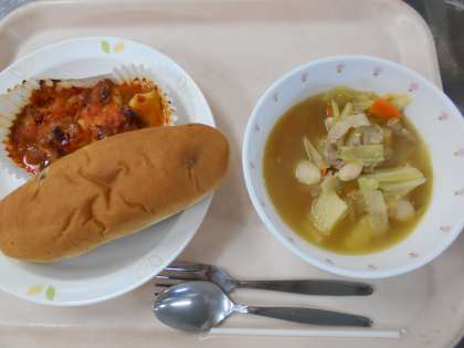 ぶどうパン 白身魚のピザ風 白いんげんの田舎風スープ 牛乳