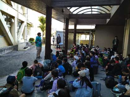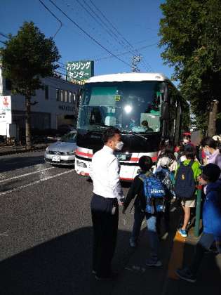 4年生が社会科見学に出発しました。中央防波堤最終処分場、潮風公園、浅草寺を見学します。予定より5分早く集合し、出発式ができました。みんなのやる気が感じられます。