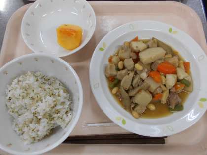 じゃこと青のりのごはん 鶏肉と里芋と豆のうま煮 柿 牛乳