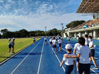 女子の13周リレーが終了しました。女子は2組が優勝しました。最後の走者に対して、男子もトラック内に入ってきて、大きな声援を送っていました。とてもすがすがしい光景でした。