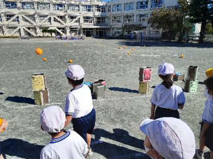 1年生の体育では「的当てゲーム」を行っています。使う的は昨年度の体力向上部の教員による手作りの的です。積み上げた的にボールが当たると「バン!」という気持ちのいい音がなります。子どもたちは当てたくて仕方ないといった様子で思いっきりボールを投げていました。勢いが弱いと音も小さく、的も倒れません。どうしたら強く投げられるか工夫したり、上手に投げている友達の真似をしたりしながら、勢いのあるボールの投げるための身体の使い方を身に付けていきました。