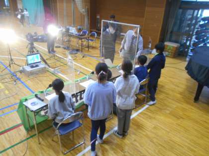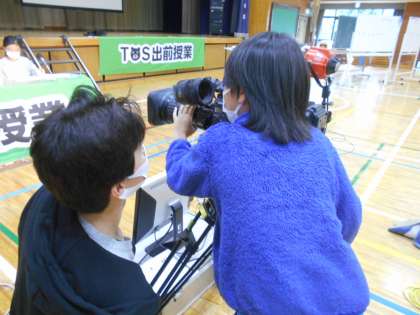 児童がアナウンサーや気象予報士、フロアディレクター、カメラマンなどを務め、ニュース動画にあわせながら原稿を読んだり、校庭から中継をしたりしました。