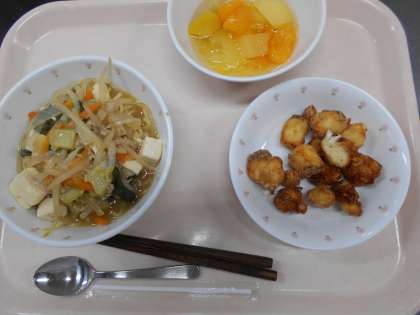 マーボーラーメン マダイのから揚げ フルーツポンチ 牛乳