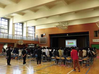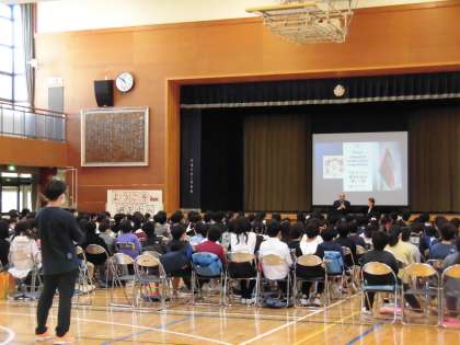 質疑応答では、英語で質問する児童もいて、普段の外国語の授業で培った力を発揮する場面もありました。会の最後は明正小の校歌を歌って、今日の訪問への感謝を表しました。