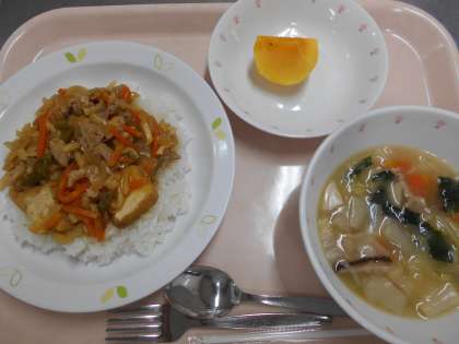 スタミナ丼 ワンタンスープ 柿 牛乳