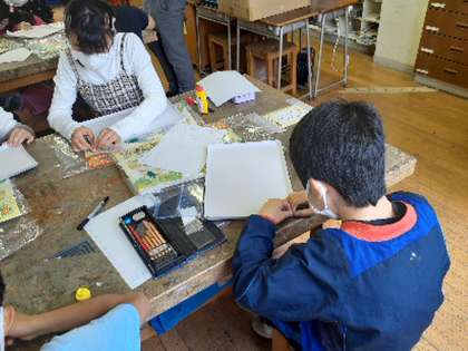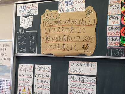 5年生の図工、題材名は「コロがるくんの旅」です。ビー玉を転がす迷路を作ります。今日のめあては、「ビー玉の転がり方を試してコースを工夫しよう。」と「転がると面白いコースやしかけを考えよう」でした。試行錯誤しながら造形的な特徴を捉え、工夫する楽しさを味わっています。出来上がりが楽しみです。
