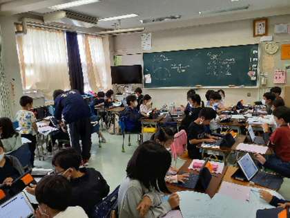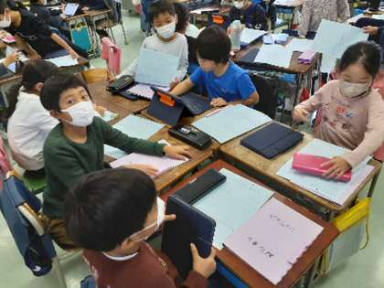 3年生の総合的な学習の時間では「まちの応援団になろう」と題して学習を進めています。身近な地域でよく目にする人たちや職業について、自分が知りたい課題を設定し、調べ学習を進めていくところです。調べるうえで一つの視点としていたのは「自分が調べる人は、どんなことに困っているのだろう」ということです。自分で予想もたてながら、今後、インタビューやインターネット等をとおして明らかにしていきます。そして「まちの応援団」となって、地域の一員としての自覚を高めていきます。