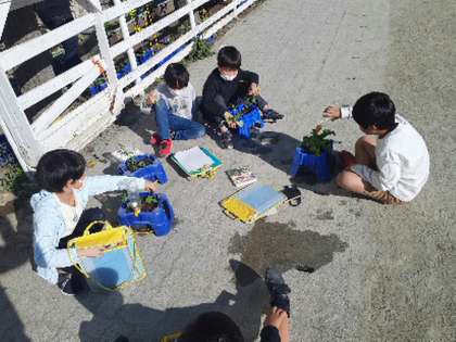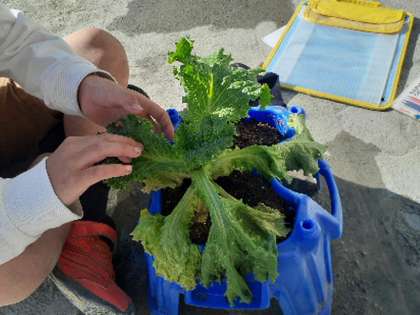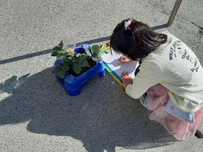 気持ちのよい太陽の光を浴びてすくすくと育っている野菜の観察を2年生がしていました。レタスやグリーンピースやイチゴなどそれぞれが思い思いのものを育てています。手触りや背の高さなど、よく見て観察カードに記し、親しみの気持ちも大きく育っています。