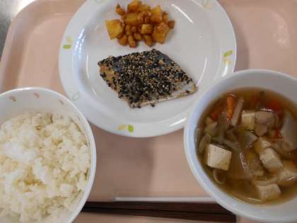 ごはん さわらの南部焼き 大豆といもの甘から揚げ けんちん汁 牛乳