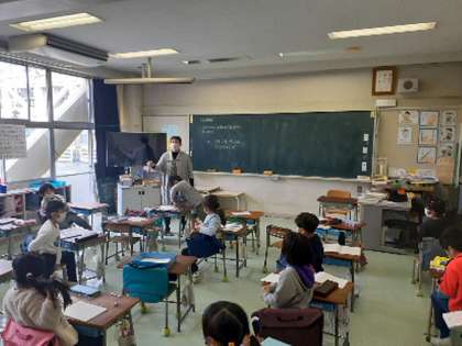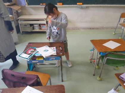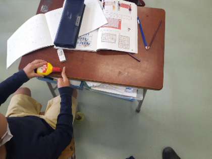 1年生の算数では、長さの学習をしています。今日の課題は机の横の長さを調べようでした。どうやって調べるかを考えました。スティックのりやボンドなどみんなが共通に持っている物のいくつ分かで長さを調べようと決まりました。でも調べるときに、一つしかないスティックのりを動かすとずれてしまってうまく調べられません。ある子は、一つ分の終わりのところに下敷きを置き目印にしながら調べる方法を見付けました。担任がその様子をみんなに伝え、みんなが、ずれないように調べることができました。