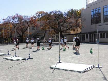 踏切足、あげ足、抜き足の3つに注意するとより高く跳べるようになります。タブレットで撮影してフォームを確認し、さらに練習に取り組んでいました。