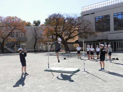 3時間目に校庭で5年生が走り幅跳びの練習をしました。初めは低い位置から跳びます。助走をつけてみんな軽々と跳ぶことができました。ただ正面から跳ぶと高く跳べなくなるので、横向きではさみ跳びできるように教員が助走のラインをひきました。線に沿って助走をとると、きれいな横向きの姿勢をとることができました。
