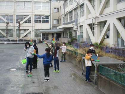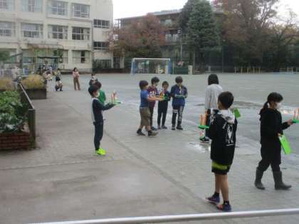 3年生は、理科で「風やゴムのはたらき」を学習しています。風やゴムの力と、物の動く様子の関係を実験を通して調べていきます。2年生の時に生活科で活動した動くおもちゃの経験が生かされているようです。今日は、雨の上がった校庭で、風の力で風車が回る様子を観察していました。