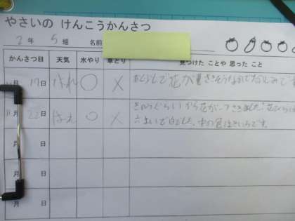 2年生が植木鉢や花壇で野菜を育てています。育て方を調べ、丁寧に植えました。大根やラディッシュ、イチゴなど、種類はさまざまです。「イチゴの花が咲いたよ。」と教えてくれて、見せてくれました。「やさいの けんこうかんさつ」カードもしっかり書けていました。優しく育てていることがよく分かります。どのような実がなるのか、楽しみですね。