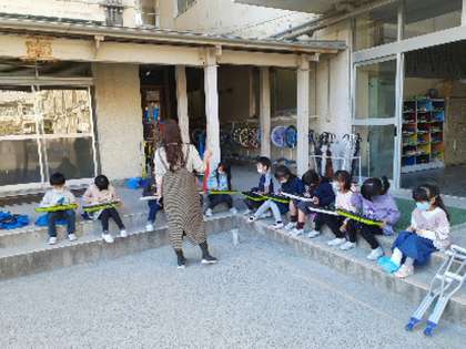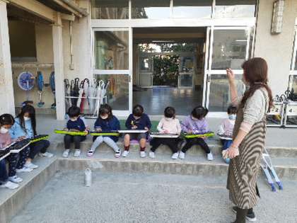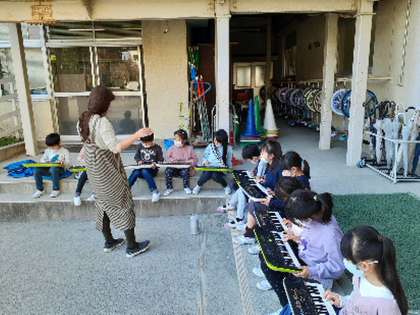 学習発表会本番に向け、少しでも完成度を上げようと、昇降口の軒下で特訓をしていました。音階を口にしながら、テンポをそろえて電子ピアノや木琴をたたく練習です。演奏に集中するとどうしてもテンポが速くなってしまうようです。その部分を改善しようと教員も一生懸命指導しました。教員と子どもたちが力を合わせてよりよい発表にしようと頑張っている姿はとても気持ちのよい光景でした。