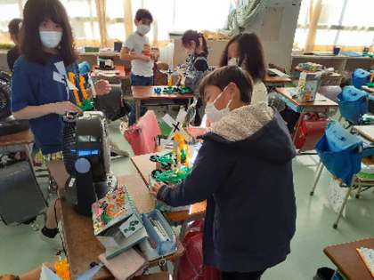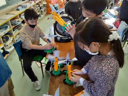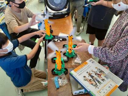 3年生の理科では風の力を利用したおもちゃづくりをしていました。風車に風を当て、回るとひもを巻き付け、物を持ち上げることができるおもちゃです。完成したおもちゃは、これから様々な条件で行う実験に利用します。楽しみながら、風のはたらきについて学んでいきます。