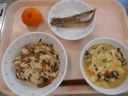 豆入りひじきごはん ししゃものからあげ かきたま汁 みかん 牛乳