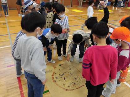 はじめは、1年生が「いらっしゃい、いらっしゃい。」と元気に声をかけても園児さんは恥ずかしがっていました。積極的な1年生が、やさしく声をかけたり手をつないだりしてあげると次第に慣れて、笑顔でお店を回れるようになりました。中休みには6年生が遊びに来てくれて、いっそう盛り上がりました。