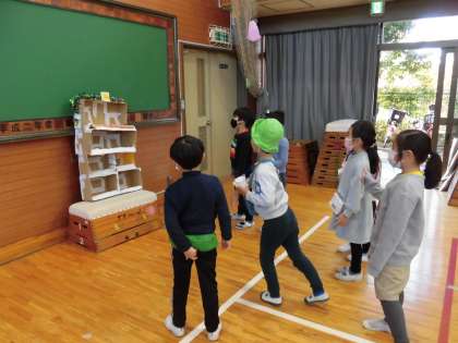 今日の2,3時間目には、喜多見保育園とはあと保育園の園児さんを招いてあきまつりを行いました。