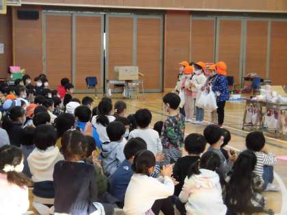 会の終わりには、園児さん、ひまわり学級の児童、1年生それぞれに感想を発表してもらいました。「楽しかった。」「1年生がやさしかった。」「はじめは緊張したけどいっぱい遊べた。」「お客さんがいっぱい来て嬉しかった。」「またやりたい。」という言葉が聞かれました。一つ一つのお店をたっぷりと時間をかけて遊んだ園児さんは、たくさんのお土産を手ににこにこしながら帰っていきました。