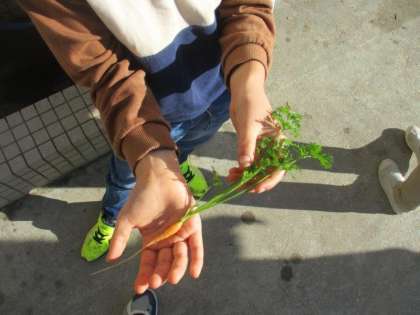 2年生が生活科で育てている野菜が大きくなってきました。太陽の日差しが暖かい中で、子どもたちは、観察カードやタブレットパソコンに記録をしています。葉の枚数が増えたことや花が咲いたこと、茎が長く伸びたことなどを見付け、記録していました。大きく育った二十日大根や、スリムなニンジンも見せてくれました。