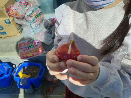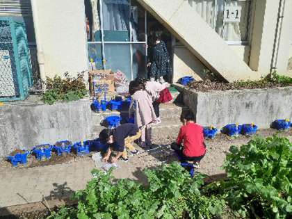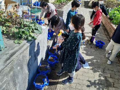 ぽかぽかした陽射しが差す気持ちのいい陽気の中、1年生が鉢植えに何かしていました。鉢植えにあったアサガオは種をつけ、役目を終えました。今度からはチューリップなどを球根から育て、春の花を咲かせようと張り切っていました。寒い冬を乗り越え、色とりどりの花が咲く日を楽しみにしてお世話を続けていきます。