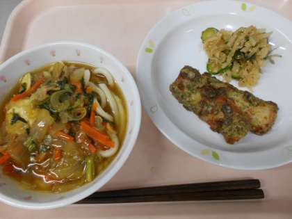 カレーうどん ちくわのいそべ揚げ じゃこサラダ 牛乳