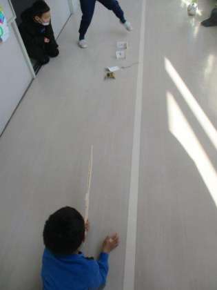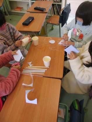 2年生が生活科で、仕組みを考えておもちゃづくりをしています。ゴムや磁石、風の力を利用して遊べるおもちゃです。ゴムの力を使った的当てや飛び出すおもちゃ、風の力のパラシュートなど、調べたり、友達と相談したりして工夫しています。できたおもちゃを見ると、感心させられるものがいくつもあります。子どもたちのもっているアイディアに驚かされます。