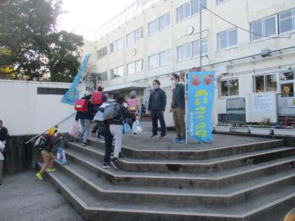 明正小の前を通る砧中生もあいさつをしてくれます。(高校生もあいさつをしてくれます。)