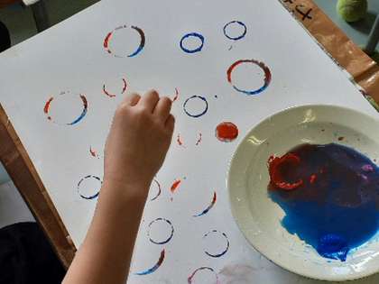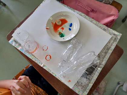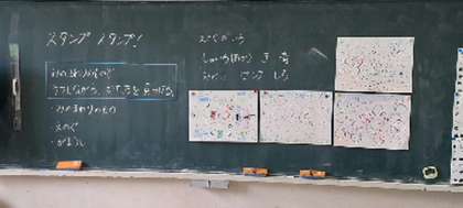 1年生の図工「みのまわりのものでうつしながらかたちを見つける」というめあてです。ペットボトルキャップやプリンカップ、小さな器に絵の具をつけて、ペタペタと画用紙にうつしていきました。はじめは、「手が汚れる!」という声も聞こえましたが、しばらくすると熱中していました。そして、「あっ、車に見える」「お花を見つけた」などめあてを達成している子がたくさんいました。