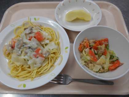 スパゲティクリームソース ポテト入りツナサラダ りんご 牛乳