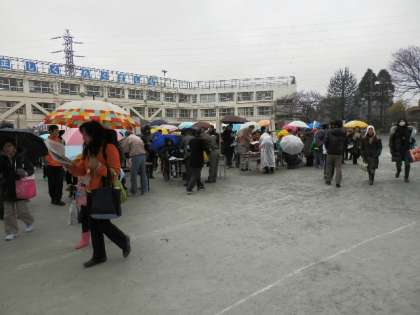 土曜公開日となったこの日は、4時間目に避難訓練とともに、地域の皆さんによる避難所開設の訓練を実施しました。前日からの雪と寒さの中、4時間目に引き取りをしていただき、そのままの流れで避難所開設するという想定でした。本当に寒い中でしたが、参加してくださった皆さんは整然と並ばれ、避難教室へと移動しました。3月11日以降、いつ来るかわからない震災に備えた意見をたくさんいただいています。今回の実態や課題をしっかりと検討して、非常時に備えたいと考えています。