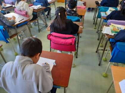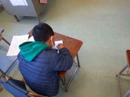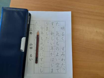 2年生は硬筆での書き初めです。手本をよく見て書き始める位置や線の長さなどに注意を払いながら、真剣に取り組んでいました。この機会がきっかけとなり、日頃から字形やバランスなどに気を配り、美しい文字が書けるようになるといいですね。