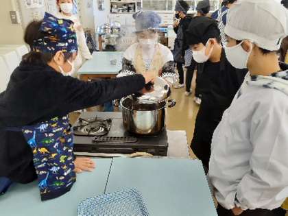 田植えと稲刈り体験を経て収穫できたもち米が年末に学校に到着しました。体験で米作りに関わった5年生が、そのもち米でお赤飯を作りました。みんなで力を合わせてたくさん、おむすびを作りました。職員室にも持ってきてくれて、みんなでおいしくいただきました。