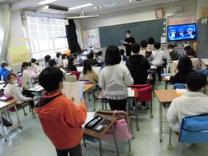2年生が日本語の授業で室尾犀星の「ふるさと」の詩について学びました。初めは言葉の響きやリズムを味わうためにいろいろな方法で音読を繰り返しました。次に詩の表している情景や季節について考えました。季節は「雪」から冬という意見が多く出ましたが、雪が少しずつとけていく様子や「もえよ木の芽の薄緑」から春の始まりを表していると読み取った児童もいて、理解の深さを感じました。最後に、自分の住む都会よりもゆっくり春が訪れる作者の「ふるさと」を思い浮かべながら、感じたことを文章にまとめました。担任から、この詩から感じる春の喜びを、2年生から3年生になるときにクラスのみんなにも感じてほしいという言葉が送られました。