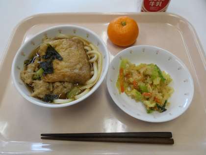 おしょうがつうどん 和風サラダ みかん 牛乳