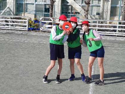 5年生体育は、「アルティメット」を行っています。フリスビーのような柔らかい円盤をパスしながら、相手陣内の得点ゾーンを目指します。サッカーとは違い手で扱うことができるので声を出し合いながら楽しくプレーしていました。